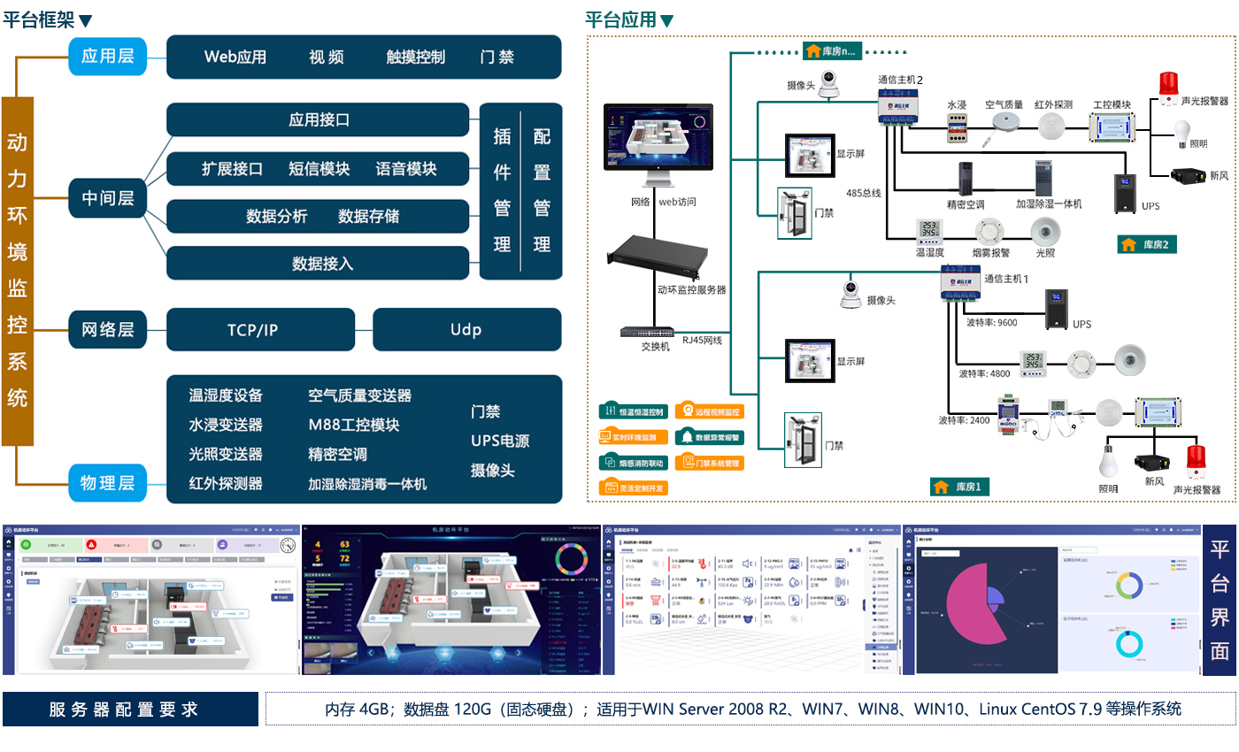 動力環境監控系統主要由設備層(溫濕度變送器、水浸變送器、光照變送器、紅外探測器、空氣質量變送器、M88工控模塊、精密空調、加濕除濕消毒一體機、UPS電源、攝像頭、門禁及其它測控設備)、管理裝置、局域網服務器、采集計算機、數據服務器、Web服務器及監控管理軟件等構成。系統設計采用先進的軟硬件技術和分層分布式網絡結構,針對客戶的實際情況提供解決方案,是廣大企業提高科學倉儲水平的好幫手。
