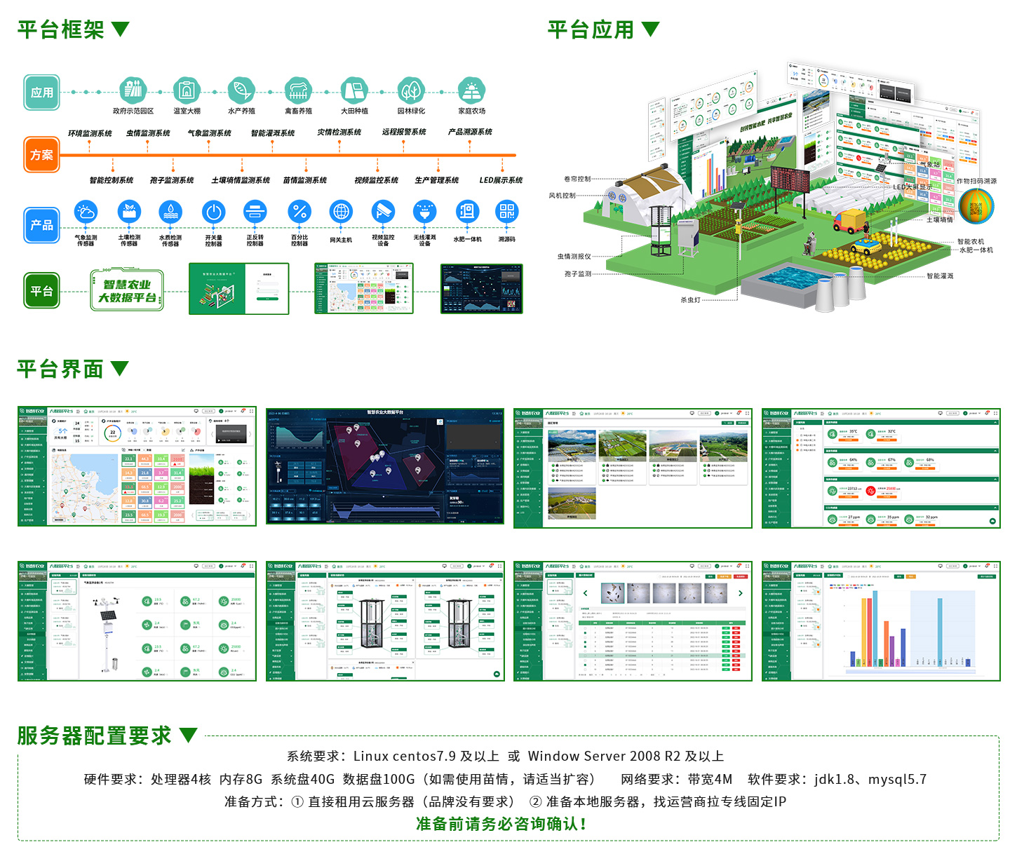 平臺可(ke)兼容幾百種(zhong)采集要素,能(neng)夠實現(xian)7 * 24小時不間斷(duan)的(de)對(dui)空氣溫(wen)濕度、光照、土壤(rang)溫(wen)度水分、CO2 濃度等環(huan)(huan)境(jing)參數(shu)進行監測,并以數(shu)字、圖(tu)形和圖(tu)像等多種(zhong)方式(shi)進行顯示、記錄和分析,監測點位可(ke)多達上(shang)千(qian)個;配合我司智能(neng)控(kong)制設備(bei),可(ke)對(dui)現(xian)場的(de)各種(zhong)電機,例如內外遮(zhe)陽、濕簾風機、噴淋(lin)滴(di)灌、頂窗側窗、加溫(wen)補(bu)光等,進行遠(yuan)程手動或自動的(de)控(kong)制,從而創(chuang)造良好的(de)生長環(huan)(huan)境(jing)條件。除此之外,針對蟲情(qing)、孢子、氣象、土壤、灌溉等方方面(mian)面(mian),我們也擁有相應的智慧管理硬件設備和軟件模塊(kuai),搭配苗情(qing)災情(qing)和視(shi)頻監控,能夠有效解(jie)決我國(guo)農業生產中四(si)情(qing)監測、綠色防控等瓶(ping)頸問題,符合(he)農業需求,實現供(gong)需有效對接。另外,平臺集多年的(de)(de)(de)農業(ye)種(zhong)(zhong)植(zhi)經驗(yan),結(jie)合大數據分析,設(she)計(ji)生(sheng)產(chan)(chan)(chan)(chan)管(guan)理(li)(li)界面,可以對(dui)生(sheng)產(chan)(chan)(chan)(chan)的(de)(de)(de)各(ge)個(ge)流程(cheng)進行全(quan)方(fang)位一體化(hua)把(ba)控,節省成(cheng)本(ben)、提高效率(lv);引入了溯源機制,讓(rang)每(mei)個(ge)產(chan)(chan)(chan)(chan)品(pin)都擁有(you)一個(ge)“二維(wei)碼(ma)”,消(xiao)費(fei)者掃(sao)描即可準確了解農產(chan)(chan)(chan)(chan)品(pin)從(cong)種(zhong)(zhong)植(zhi)到銷售等全(quan)過程(cheng)的(de)(de)(de)信(xin)息,實現(xian)“從(cong)農田到餐(can)桌”的(de)(de)(de)可追溯信(xin)息化(hua)管(guan)理(li)(li);創新性的(de)(de)(de)增(zeng)加(jia)農產(chan)(chan)(chan)(chan)品(pin)價格查詢板塊,補全(quan)了生(sheng)產(chan)(chan)(chan)(chan)銷售過程(cheng)中價格存(cun)在滯后性的(de)(de)(de)缺口(kou),讓(rang)農業(ye)生(sheng)產(chan)(chan)(chan)(chan)實現(xian)精準化(hua)種(zhong)(zhong)植(zhi)、可視(shi)化(hua)管(guan)理(li)(li)、智能(neng)化(hua)決策。