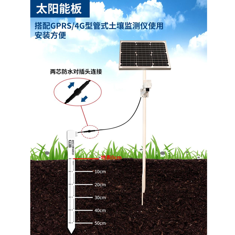 新方案GPRS/4G型管式土壤無內置電池,無按鍵開關,設備上電就能運行,電池電量耗光之后設備自動關機,有太陽后設備自動運行,無需人去現場。