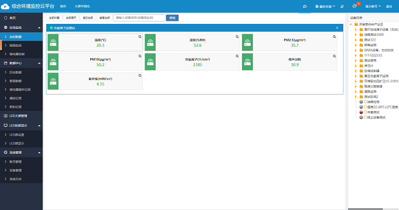 環境監控(kong)云平臺擁有電腦端(duan)、手機(ji)APP、微(wei)信(xin)公眾號、小程序四種訪問方(fang)式(shi),能(neng)夠實(shi)現實(shi)時數(shu)據(ju)查(cha)看、超限報(bao)警、歷史數(shu)據(ju)和曲線查(cha)詢/導出、設備定位、智能(neng)控(kong)制(zhi)、視頻監控(kong)與(yu)抓拍、賬號分級、大屏可視化等功(gong)能(neng)。