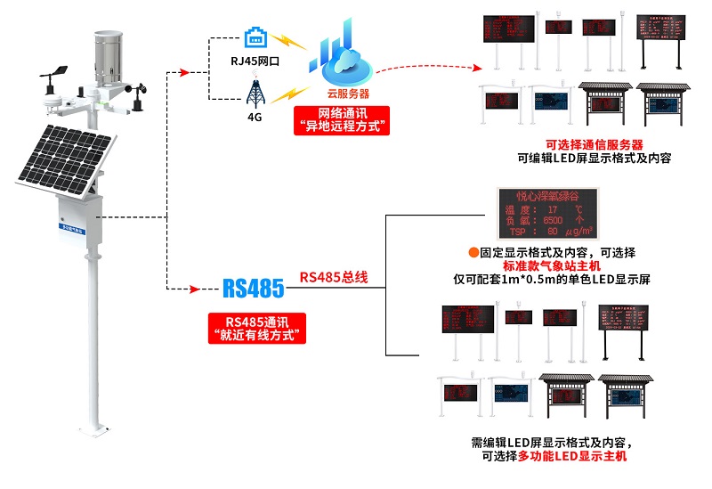 山東(dong)仁(ren)科LED顯(xian)示屏可(ke)通過RS485通訊(xun)(xun)“就(jiu)近有線方式(shi)”獲取負氧離子監測站的實(shi)時(shi)數據,也(ye)可(ke)通過4G或以太網網絡通訊(xun)(xun)方式(shi)“異地遠程”獲取云端數據進行現場顯(xian)示。