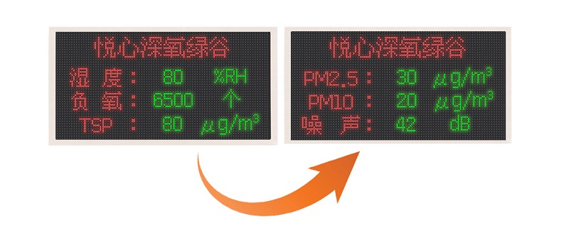● LED顯示(shi)屏可同(tong)時(shi)顯示(shi)多個監測要素(su)的(de)內容及時(shi)間(年、月、日、時(shi)、分(fen)、星期),且可通過手機APP配置軟件直接設置是否(fou)顯示(shi)。