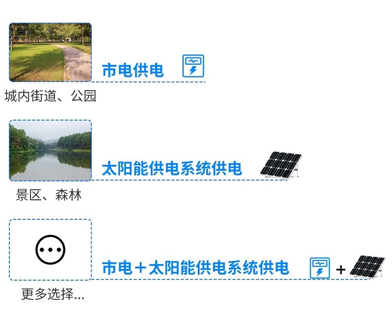 ② 在不便供電(dian)的景區、森林(lin)可(ke)以選擇(ze)太(tai)陽能供電(dian)系統供電(dian),安裝方(fang)便,可(ke)在陰(yin)雨天連續工作幾天時(shi)間,保(bao)障數據不間斷。