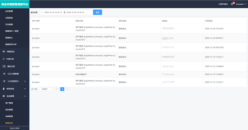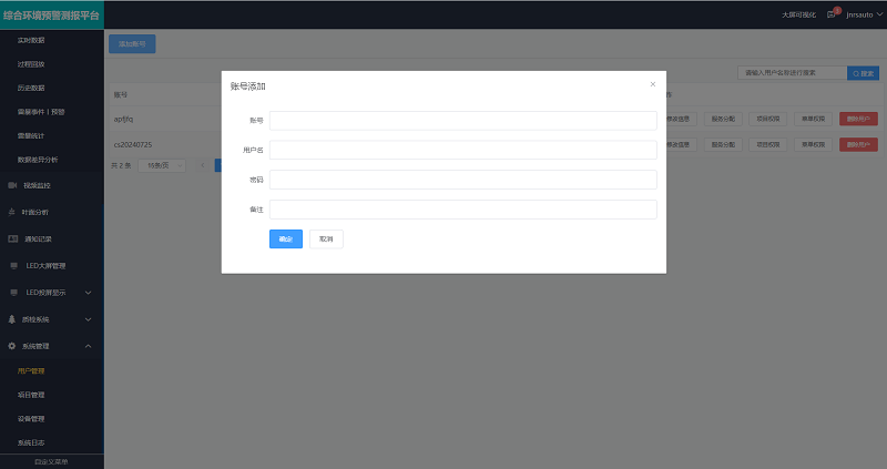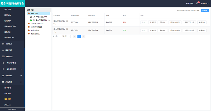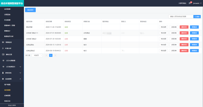 除此之外,綜合環境預(yu)警測報平臺還支(zhi)持接入公(gong)司(si)其他的(de)環境監(jian)控(kong)設備,擁有(you)視(shi)頻監(jian)控(kong)、聯(lian)動LED大屏(ping)、用戶管理(li)、項目管理(li)、設備管理(li)、系統日(ri)志等(deng)功能。