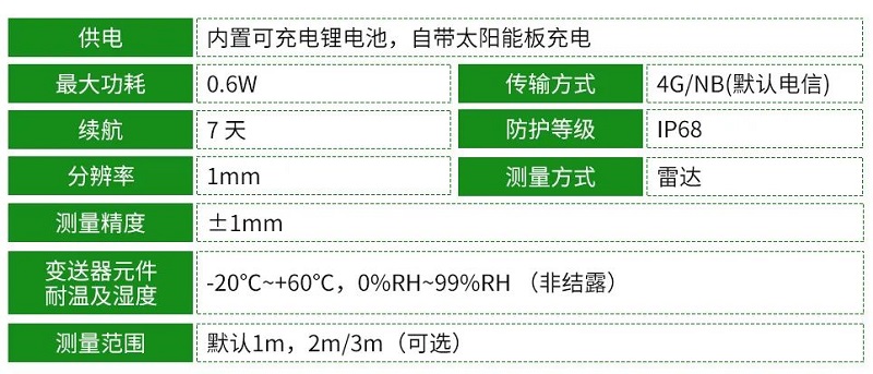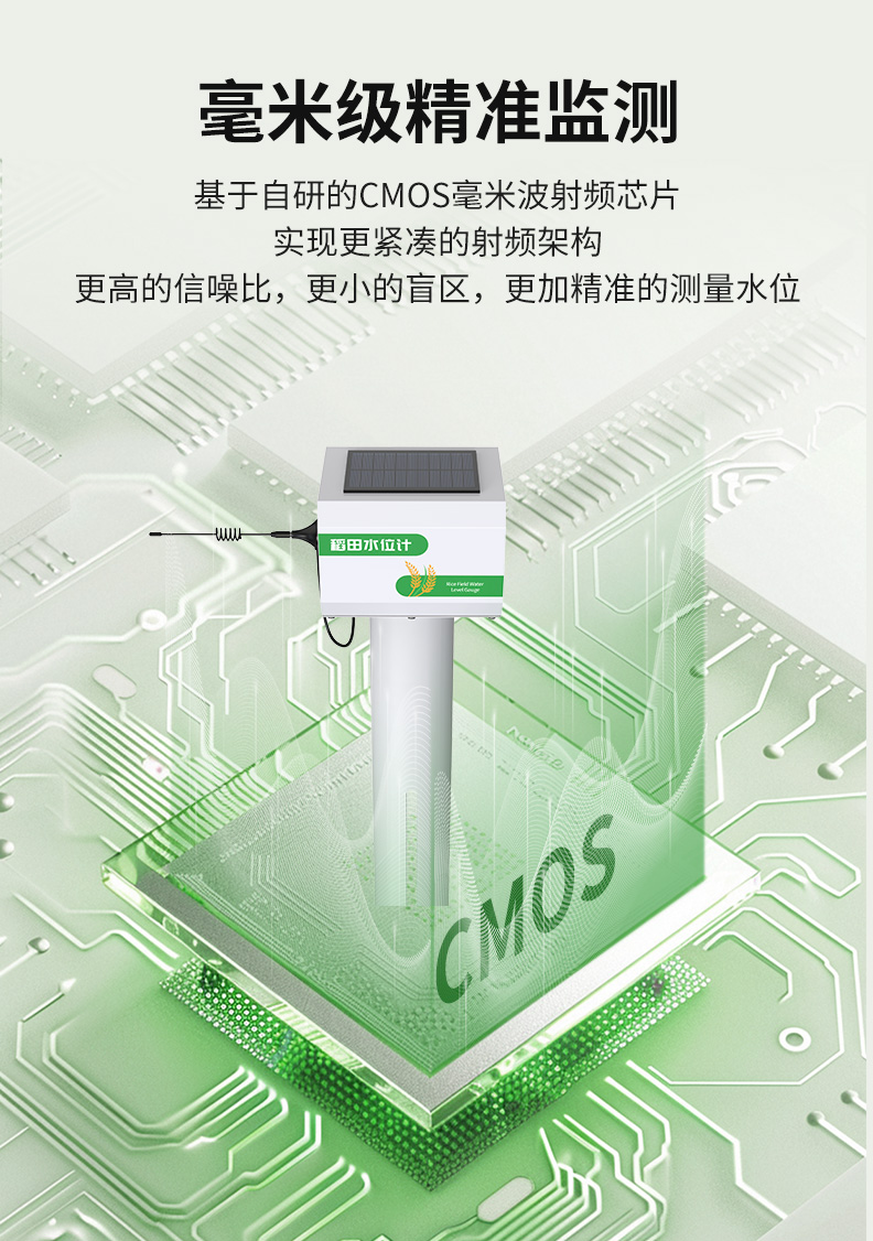 設(she)備內置(zhi)我公司自主研發的CMOS毫米(mi)波射(she)頻(pin)芯片,具(ju)有更(geng)緊湊的射(she)頻(pin)架構,實現了毫米(mi)級(±1mm)超高精度監測(ce),能(neng)夠精準捕捉田面水層(ceng)的細(xi)微變化(hua)(如蒸發滲漏(lou))。