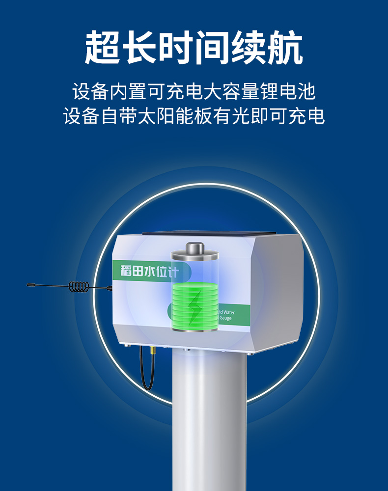 稻田(tian)水位(wei)計內置(zhi)可充(chong)電大容量鋰電池,擁有(you)超(chao)強續航(hang)能(neng)力(7天),且自帶太陽(yang)能(neng)供電系統,有(you)光即可充(chong)電,不僅減少了人工維護(hu)還有(you)效預防(fang)了因連續陰雨天無法充(chong)電而導致設備(bei)斷電的情況發生,滿(man)足了用戶戶外長期使用需求。