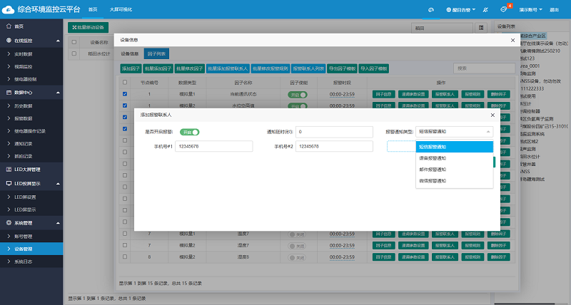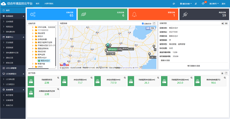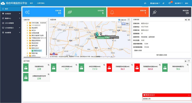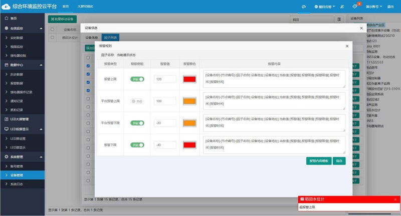 智能預警:用戶可以根(gen)據(ju)現(xian)場實際情況,自(zi)定義水(shui)位上下限,一旦(dan)出現(xian)數據(ju)異常,平臺(tai)便會(hui)以頁(ye)面數據(ju)變紅、彈窗的方(fang)式(shi)進(jin)行(xing)平臺(tai)預警,還(huan)會(hui)以電話、短信(xin)、郵(you)件、微信(xin)的方(fang)式(shi)進(jin)行(xing)遠程報警,如(ru)果(guo)有設(she)備意外離線(xian),云平臺(tai)也(ye)會(hui)向用戶發(fa)送設(she)備離線(xian)信(xin)息。