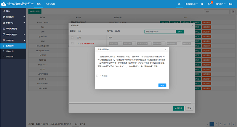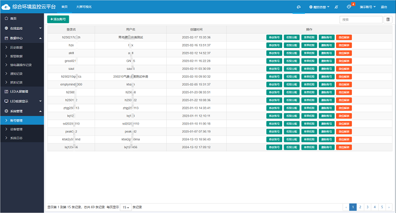 信息(xi)共享(xiang)(xiang):云(yun)平臺具有(you)完善的賬(zhang)號(hao)分(fen)級功能,可(ke)以建(jian)立多個子(zi)賬(zhang)號(hao),用戶可(ke)為每個子(zi)賬(zhang)號(hao)分(fen)配(pei)平臺管理(li)權限,實現信息(xi)共享(xiang)(xiang)。