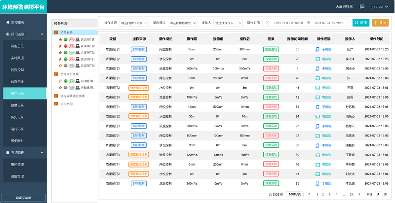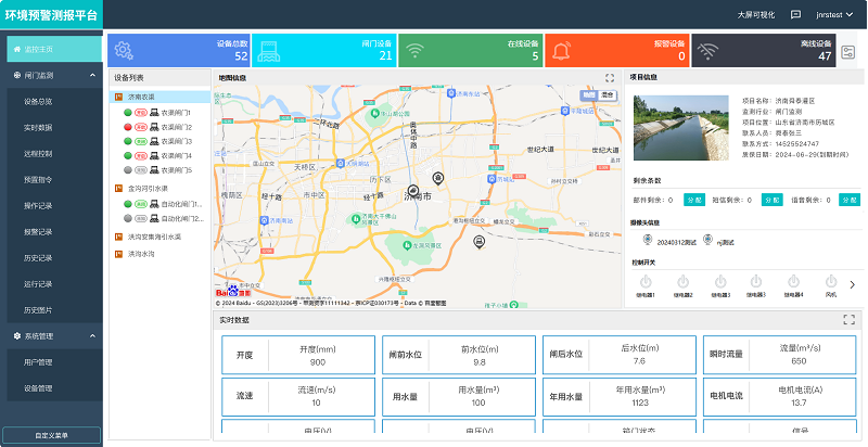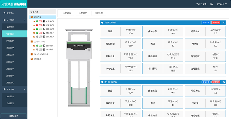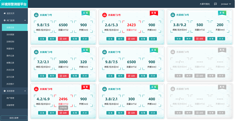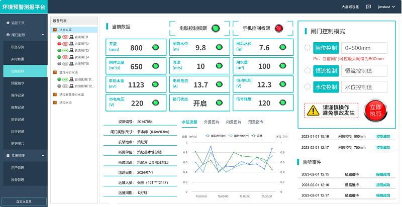 用戶還可以在云(yun)平臺(tai)中隨時(shi)查(cha)看智能(neng)灌排系統(tong)的(de)各(ge)項數(shu)據(ju),如(ru):閘(zha)(zha)門(men)開度、閘(zha)(zha)前水位、閘(zha)(zha)后水位、瞬時(shi)流量(liang)、流速、用水量(liang)、年(nian)用水量(liang)等數(shu)據(ju)信息和(he)視頻畫面,監控水流動(dong)態等,避(bi)免(mian)過度灌溉或缺(que)水現象。除自動(dong)控制外,系統(tong)還支(zhi)持手動(dong)控制閘(zha)(zha)門(men),更(geng)好的(de)實現了管(guan)理的(de)便捷化與實時(shi)化。