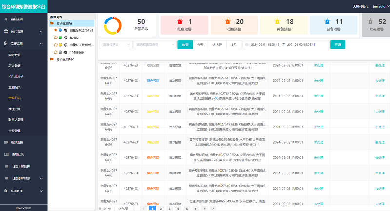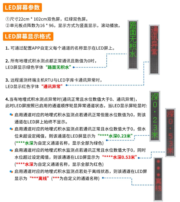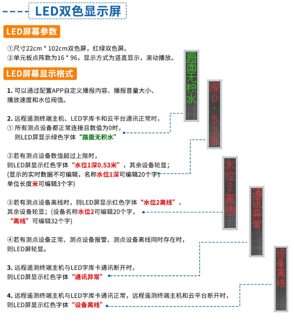其中,積水(shui)監測站中一個LED顯示屏(ping)可輪顯多個測點的數(shu)據,當出(chu)現(xian)通訊異(yi)常(chang)、數(shu)據超限等(deng)情況,LED顯示屏(ping)中的內容及顏色也會發生變化。