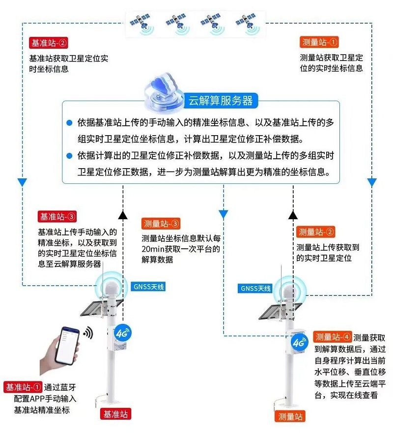 公路(lu)邊坡GNSS位移監(jian)測站采用(yong)“1+N”組網模式(1個基準站+N個測量站)突破傳統監(jian)測設(she)備(bei)距(ju)離限制,支持長距(ju)離公路(lu)、跨(kua)區域橋梁的同步監(jian)測。