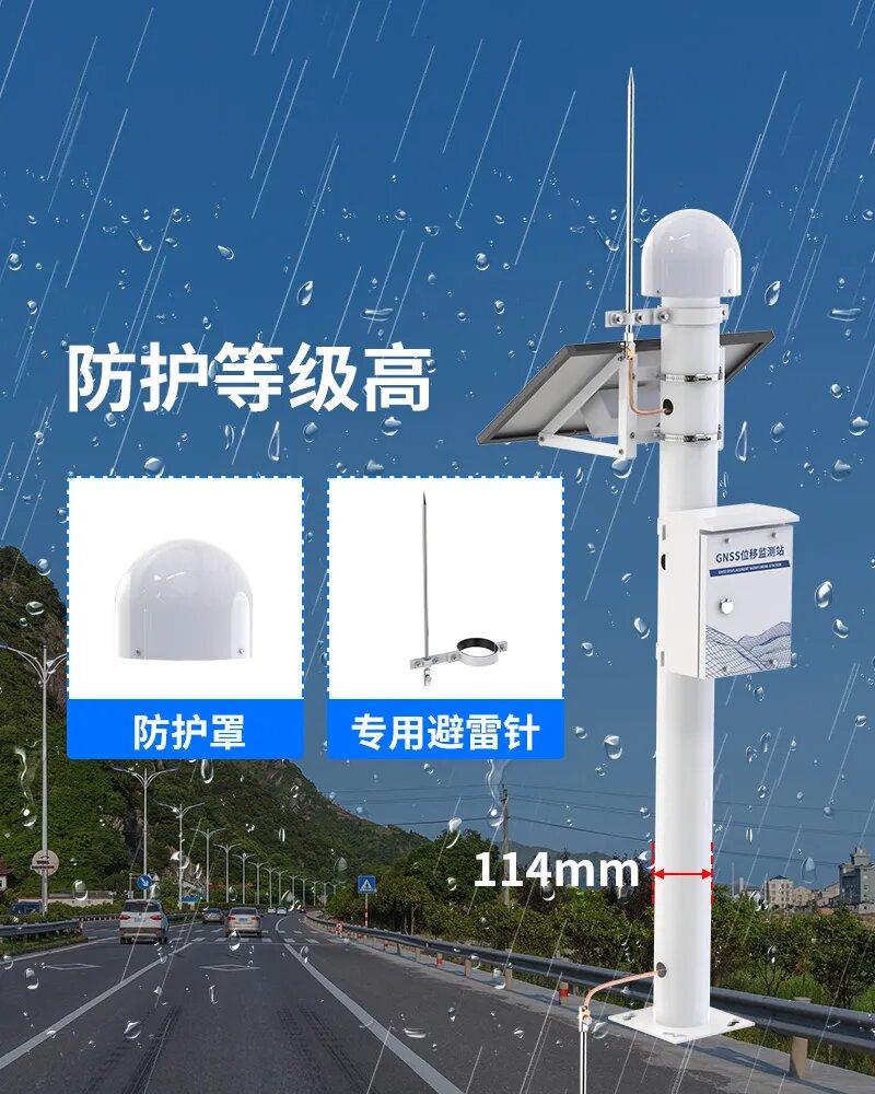 公路邊坡GNSS位移監測站防(fang)護等級高,通體(ti)采用金屬材質,表面涂有特殊涂層,搭配耐腐蝕的GNSS天線保護罩,能夠(gou)在(zai)暴雨、沙塵等極端條件下連續(xu)工作,持(chi)續(xu)輸(shu)出(chu)監測數據;立桿(gan)支架(jia)(直徑114mm)符合《地質災害專群結合監測預警技(ji)術指南(試(shi)行(xing)) 》標(biao)準,用戶可放心(xin)使用;加入專用避雷針,有效保護設備安全。