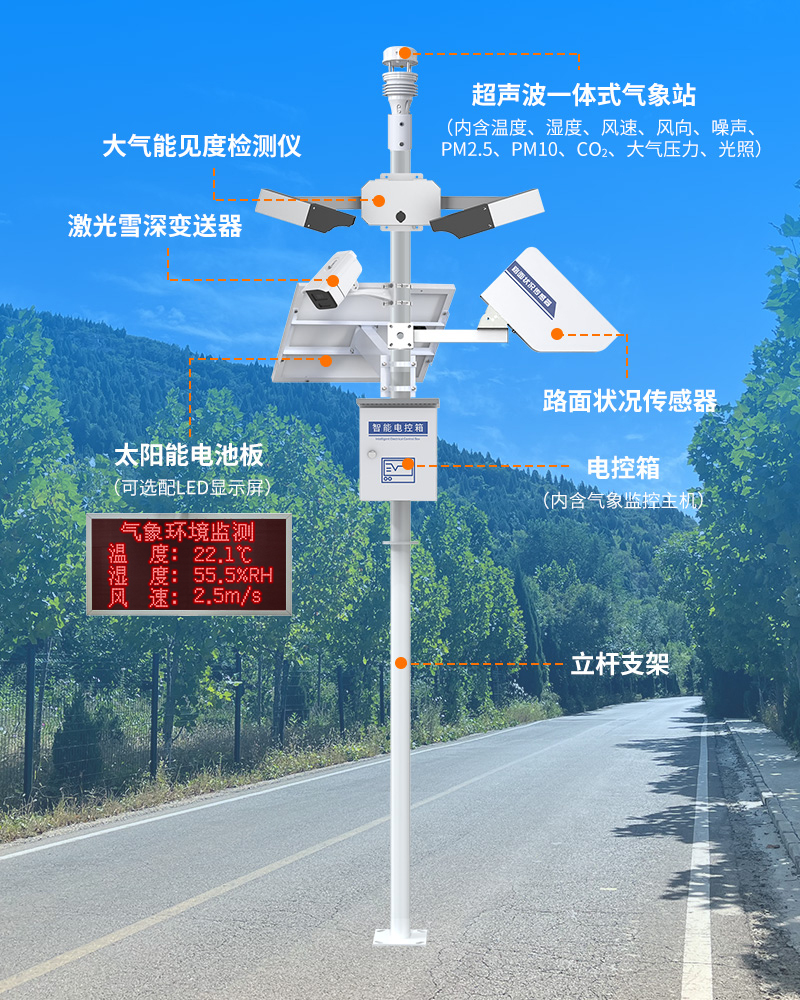 山東仁科公路交通氣象站主要由 各(ge)類(lei)氣象傳(chuan)(chuan)感(gan)器(qi)、大(da)氣能(neng)見度檢測(ce)儀、路面狀況傳(chuan)(chuan)感(gan)器(qi)、激光(guang)雪深變送器(qi)、電(dian)(dian)控箱、立桿(gan)支架、供電(dian)(dian)系(xi)統和顯示(shi)屏組(zu)成。通過對氣象要素的(de)監(jian)測(ce)、上(shang)傳(chuan)(chuan),提升公路交通氣象基礎監(jian)測(ce)能(neng)力,幫助工作(zuo)人(ren)員排查公路濃霧(團霧)、道(dao)路結(jie)冰、強降(jiang)水、大(da)風等災害(hai)隱患(huan)點。