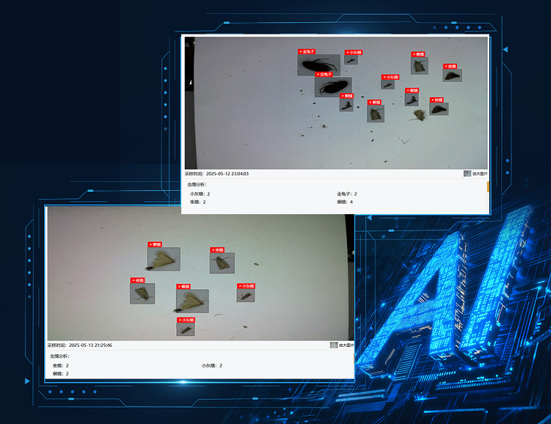 2- 結合AI圖像(xiang)優(you)化(hua)算法,消(xiao)除運動(dong)(dong)拖影(ying),實現蟲體高清還原;數據(ju)庫上萬害(hai)蟲模型對比,可自動(dong)(dong)標(biao)注害(hai)蟲種(zhong)類并分類計(ji)數;解決了傳統蟲情監測依賴人(ren)工(gong)目(mu)視(shi)判別,存在夜間無法作業、微小蟲體漏檢(jian)、種(zhong)類誤判率高等痛點。