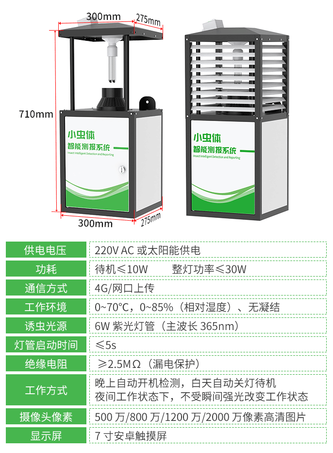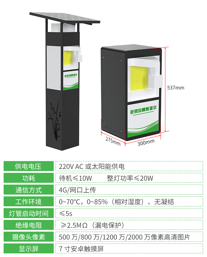 小蟲(chong)體智能(neng)測報系統 采用特殊定制的(de)進蟲(chong)口過濾結(jie)構,結(jie)合(he)蜂巢式(shi)幾何結(jie)構,可實現毫米級害蟲(chong)的(de)精(jing)準捕獲(僅允許體長≤5mm的(de)害蟲(chong)通過),且 結(jie)構材質為(wei)表面噴有防腐涂層鈑金(jin),可保(bao)障設備戶外長期使用不(bu)生銹。