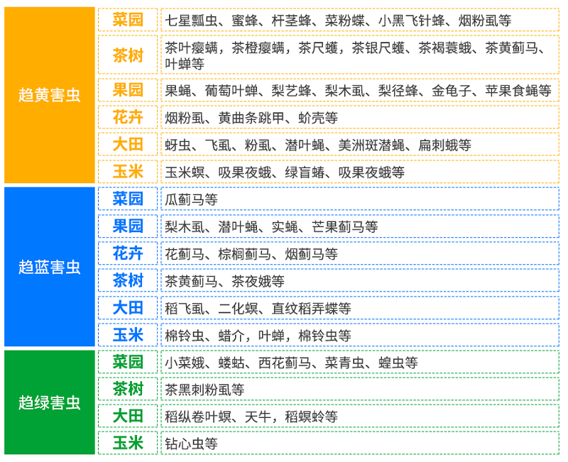 昆蟲(chong)在(zai)長(chang)期的(de)(de)進(jin)化(hua)過程中產生了對(dui)色彩的(de)(de)趨性,也稱為“色覺”。這類害(hai)蟲(chong)多在(zai)白(bai)天活動,不同害(hai)蟲(chong)對(dui)色彩的(de)(de)趨性也有(you)特(te)定的(de)(de)選擇和愛好,且(qie)不同性別和發育階段均可有(you)差異。