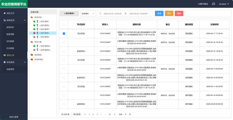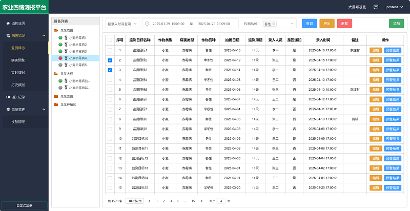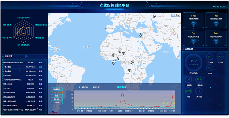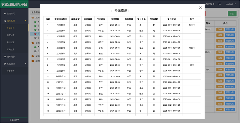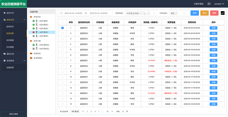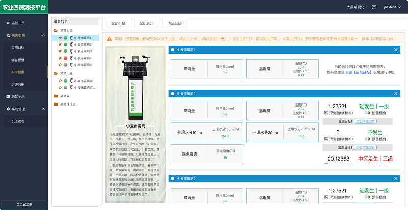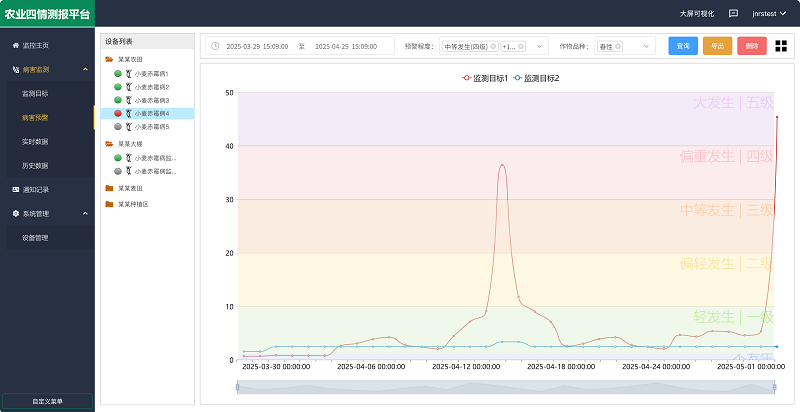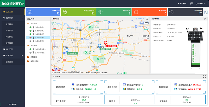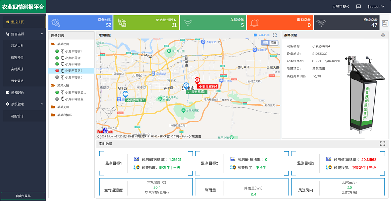農業(ye)四情測(ce)報(bao)平(ping)臺 是山東仁科回饋(kui)用戶的(de)免(mian)費綜合(he)管理平(ping)臺,其(qi)中(zhong) 病(bing)害(hai)監測(ce)板塊包(bao)括(kuo)【監測(ce)目標】【病(bing)害(hai)預警】【實時(shi)數據(ju)(ju)(ju)】【歷史(shi)數據(ju)(ju)(ju)】四個子版塊,真正實現(xian)病(bing)蟲(chong)害(hai)防控的(de)智能化、協(xie)同化、高效化,為現(xian)代農業(ye)植保提供全方(fang)位的(de)數據(ju)(ju)(ju)支撐(cheng)。