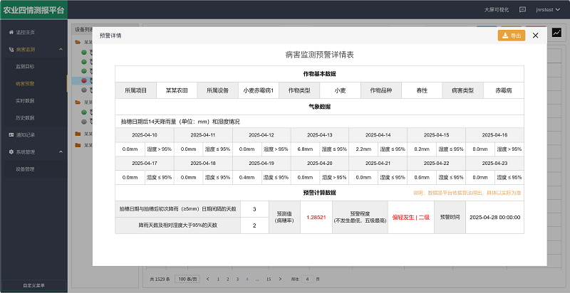 用戶可以通(tong)過平臺自(zi)定義設置監(jian)測目(mu)標,填寫小(xiao)麥品種(春性、半(ban)冬(dong)(dong)性、冬(dong)(dong)性)、生(sheng)(sheng)(sheng)長周期(qi)(抽穗(sui)日期(qi))及監(jian)測周期(qi)等(deng)(deng),平臺會根據內置算法自(zi)動(dong)生(sheng)(sheng)(sheng)成生(sheng)(sheng)(sheng)成《病害監(jian)測預(yu)(yu)警詳情表》,內容包括氣(qi)象(xiang)數據、預(yu)(yu)測值和預(yu)(yu)警等(deng)(deng)級(ji)(由低(di)到(dao)高依次為不發(fa)生(sheng)(sheng)(sheng)/輕發(fa)生(sheng)(sheng)(sheng)(一(yi)級(ji))/偏輕發(fa)生(sheng)(sheng)(sheng)(二級(ji))/中等(deng)(deng)發(fa)生(sheng)(sheng)(sheng)(三級(ji))/偏重發(fa)生(sheng)(sheng)(sheng)(四級(ji))/大發(fa)生(sheng)(sheng)(sheng)(五級(ji)))等(deng)(deng),一(yi)旦預(yu)(yu)警等(deng)(deng)級(ji)超過上限,會通(tong)過數據變紅、短信、語音(yin)、郵件的形式在指定時(shi)間向用戶進行預(yu)(yu)警,確(que)保用戶獲取最(zui)新預(yu)(yu)警信息(xi)。