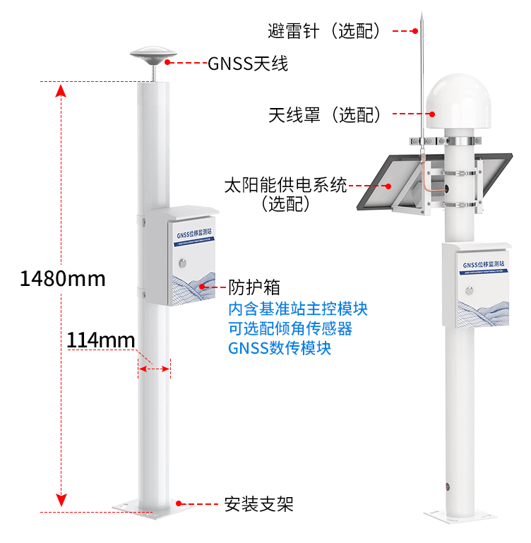 ② 戶外環境復雜,GNSS位移監測(ce)(ce)站時常面(mian)臨狂風(feng)、暴雨等惡劣天氣的侵(qin)襲,普通立桿存在傾倒風(feng)險,無法保(bao)障設(she)備正常運(yun)行(xing)。GNSS位移監測(ce)(ce)站采用了直徑114mm的加強立桿,符合《地質災害專(zhuan)群(qun)結合監測(ce)(ce)領警(jing)技(ji)術指南(試行(xing))》中(zhong)“GNSS立桿直徑應≥90mm”的規定(ding),粗壯的立桿為(wei)設(she)備提供了穩固(gu)的支撐基礎(chu),保(bao)證了監測(ce)(ce)數據的連續(xu)性和準確性。