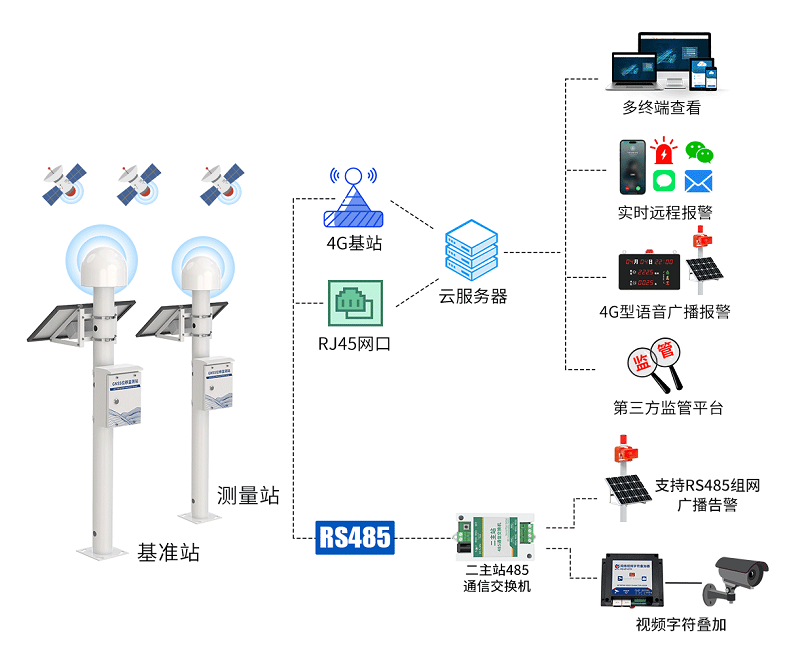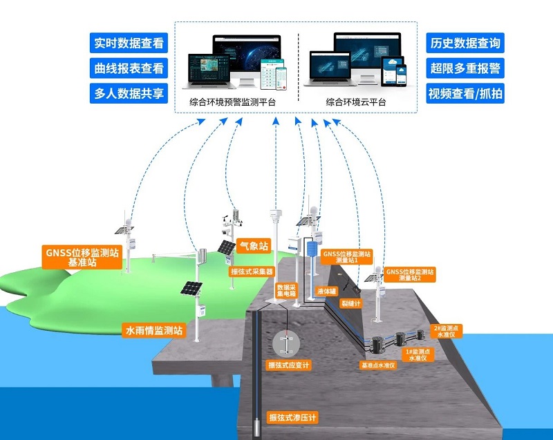 GNSS位(wei)移(yi)監(jian)測(ce)站作(zuo)(zuo)為地(di)質災(zai)害(hai)(hai)監(jian)測(ce)設備,還(huan)可(ke)與水(shui)(shui)雨(yu)情(qing)監(jian)測(ce)站、氣象站、壓差式靜力水(shui)(shui)準儀(yi)、滲(shen)壓計、裂(lie)縫計等設備協同工作(zuo)(zuo),組成地(di)質災(zai)害(hai)(hai)監(jian)測(ce)預警系統,將(jiang)數(shu)據上(shang)傳至(zhi)環(huan)境(jing)(jing)監(jian)控(kong)云平(ping)臺(tai)(tai)(綜合(he)(he)環(huan)境(jing)(jing)監(jian)控(kong)云平(ping)臺(tai)(tai)/綜合(he)(he)環(huan)境(jing)(jing)預警測(ce)報平(ping)臺(tai)(tai)),通過數(shu)據交叉驗證提(ti)高監(jian)測(ce)結果的可(ke)靠(kao)性(xing),多源信息融合(he)(he)構建更精確的預警模(mo)型,利用不(bu)同監(jian)測(ce)維度的數(shu)據進行(xing)互補,完整還(huan)原(yuan)地(di)質災(zai)害(hai)(hai)演化過程,為科學制定防災(zai)措施提(ti)供決策支撐。