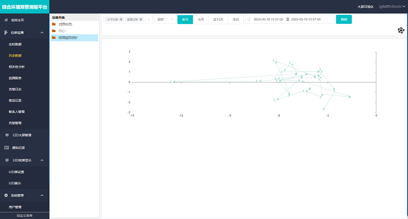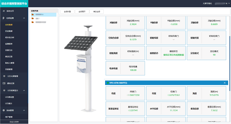 GNSS位(wei)(wei)(wei)移(yi)(yi)監(jian)(jian)測(ce)(ce)站能(neng)夠將采(cai)集到的位(wei)(wei)(wei)移(yi)(yi)數(shu)(shu)(shu)據實時(shi)(shi)(shi)上(shang)傳(chuan)至環境(jing)云平臺(tai)。用戶(hu)只需在電腦或(huo)移(yi)(yi)動(dong)設備(bei)上(shang)登錄(lu)云平臺(tai),就 可(ke)隨時(shi)(shi)(shi)隨地查看各(ge)個監(jian)(jian)測(ce)(ce)站的實時(shi)(shi)(shi)數(shu)(shu)(shu)據,如(ru),設備(bei)所在經緯度、水平位(wei)(wei)(wei)移(yi)(yi)數(shu)(shu)(shu)據、垂直位(wei)(wei)(wei)移(yi)(yi)數(shu)(shu)(shu)據、Y軸(zhou)位(wei)(wei)(wei)移(yi)(yi)數(shu)(shu)(shu)據、X軸(zhou)位(wei)(wei)(wei)移(yi)(yi)數(shu)(shu)(shu)據、Z軸(zhou)位(wei)(wei)(wei)移(yi)(yi)數(shu)(shu)(shu)據等,有效提高了數(shu)(shu)(shu)據獲取(qu)時(shi)(shi)(shi)效性,避(bi)免因(yin)錯過處置時(shi)(shi)(shi)機(ji)而造成(cheng)損失。