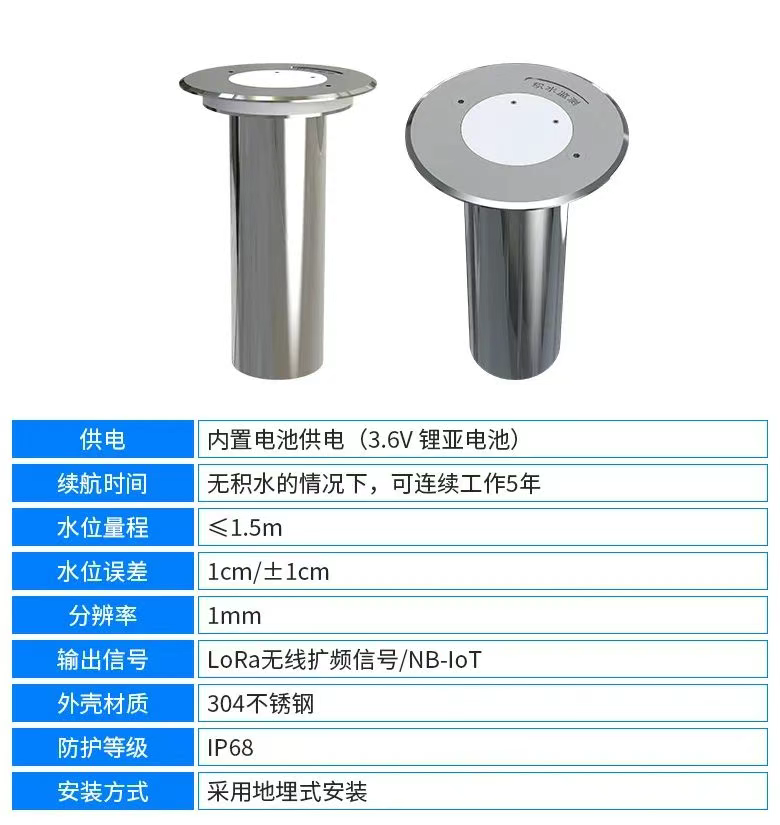 地埋式(shi)積水測點 由防水防腐 304 不銹鋼外殼、水位檢(jian)測模(mo)塊(kuai)(積水深度、積水狀態)、藍牙配(pei)置(zhi)模(mo)塊(kuai)、LoRa 無線通訊模(mo)塊(kuai)、鋰亞電池等組成,具(ju)有隱蔽(bi)性與環境適應性強、支持無線數據傳輸、續航時間長達五年(nian)的優勢。