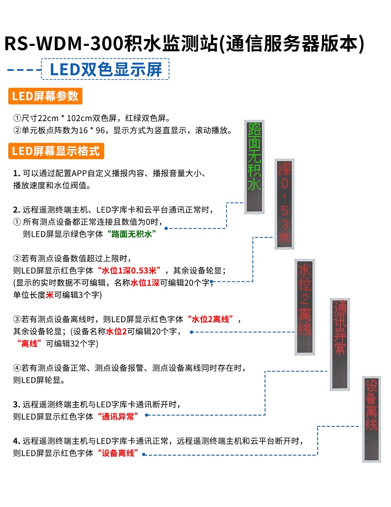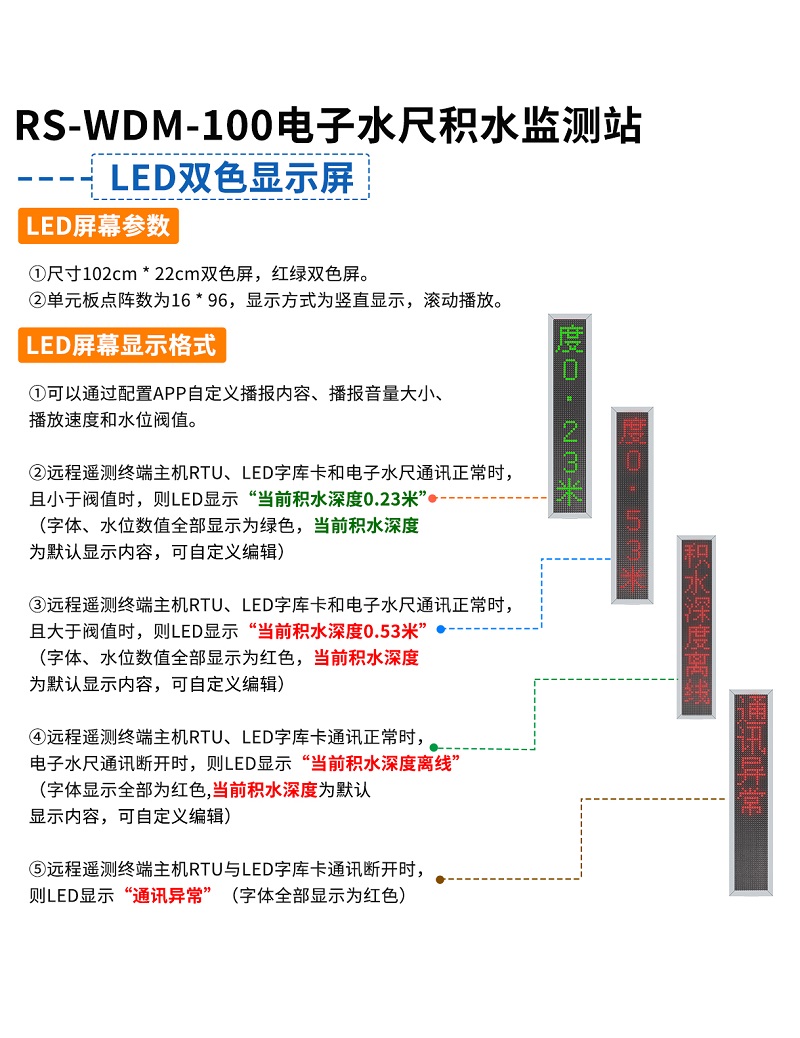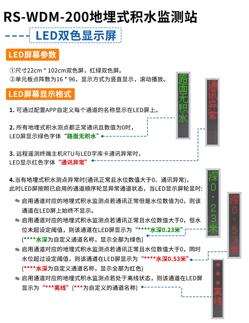 積水監測(ce)站的(de)現(xian)場LED顯示(shi)(shi)屏能夠實時輪(lun)播顯示(shi)(shi)多個(ge)監測(ce)點的(de)積水深度數(shu)據。在(zai)正常工作狀(zhuang)態下,顯示(shi)(shi)屏會以綠色(se)字(zi)體(ti)清晰(xi)展(zhan)示(shi)(shi)各測(ce)點的(de)實時水位信息(xi),并按照預設的(de)時間(jian)間(jian)隔(ge)自(zi)動(dong)切(qie)換(huan)不同監測(ce)點的(de)數(shu)據;當設備離(li)線/通訊(xun)異常/數(shu)據超限時,顯示(shi)(shi)屏會自(zi)動(dong)切(qie)換(huan)為醒(xing)目(mu)的(de)紅色(se)字(zi)體(ti)。