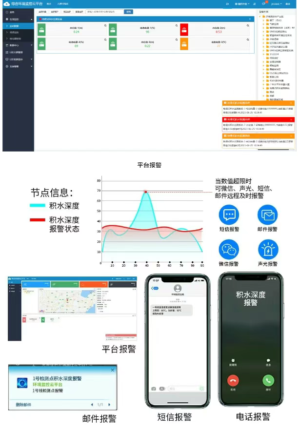 當(dang)現場積(ji)水超(chao)過安全(quan)閾值(zhi)時,環境監控云平(ping)臺會以(yi)數據(ju)變紅(hong)、彈(dan)窗、聲音等方式進行平(ping)臺報警(jing),還會以(yi)郵件、短信(xin)、電(dian)(dian)話、微信(xin)的形(xing)式進行遠程報警(jing),同時,用戶還可(ke)以(yi)通過電(dian)(dian)子(zi)地圖確認(ren)出現積(ji)水的具體地點,根據(ju)實(shi)際情況(kuang)做出決策,降(jiang)低損失。