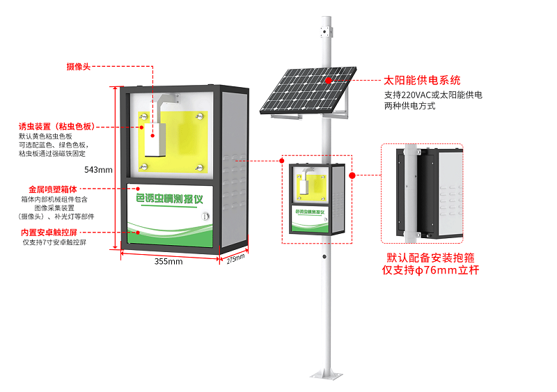 色(se)誘蟲(chong)(chong)(chong)情測報儀主(zhu)(zhu)要由(you)“金屬噴塑箱體(ti)、安(an)卓主(zhu)(zhu)控系統、高清攝(she)像頭、誘蟲(chong)(chong)(chong)裝置(黃(huang)/監/綠粘蟲(chong)(chong)(chong)色(se)板)、色(se)板固定裝置、安(an)裝底座(選配(pei)(pei))、太陽能(neng)供(gong)電(dian)系統(選配(pei)(pei))”等(deng)部件組成。