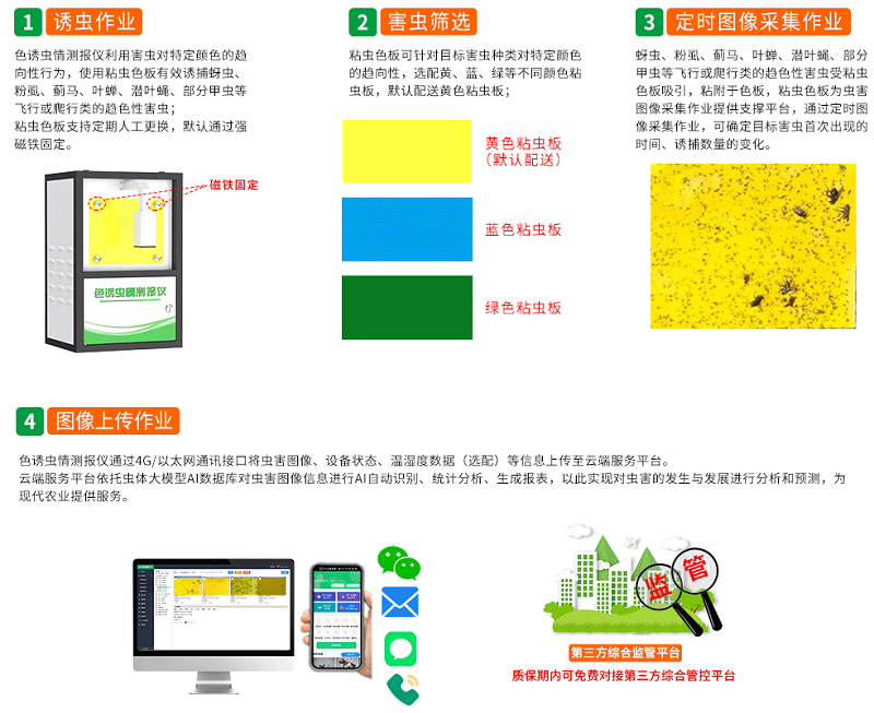 色誘蟲(chong)(chong)情測報儀采(cai)(cai)用可(ke)定(ding)期更換的(de)(de)黃、藍、綠三(san)色粘(zhan)蟲(chong)(chong)板(ban),專門誘捕具有趨色性的(de)(de)飛行(xing)或爬行(xing)類害(hai)(hai)蟲(chong)(chong)。該設(she)備(bei)基于溫(wen)控、時(shi)控及平臺(tai)聯網控制技(ji)術,結(jie)合機械組件與(yu)高清攝像(xiang)頭,可(ke)在(zai)無人(ren)值守狀態下自(zi)動(dong)完(wan)成(cheng)害(hai)(hai)蟲(chong)(chong)誘捕滅(mie)殺和定(ding)時(shi)圖像(xiang)采(cai)(cai)集(ji)等系統作業。采(cai)(cai)集(ji)數據實時(shi)上傳至【農業四情測報平臺(tai)】后(hou),依托平臺(tai)的(de)(de)【蟲(chong)(chong)體大模型AI數據庫】,對蟲(chong)(chong)害(hai)(hai)圖像(xiang)進行(xing)【AI自(zi)動(dong)識別、統計分析和報表生成(cheng)】,從而實現對蟲(chong)(chong)害(hai)(hai)發生發展態勢的(de)(de)精準(zhun)預測。該設(she)備(bei)兼(jian)具蟲(chong)(chong)害(hai)(hai)標本采(cai)(cai)集(ji)和蟲(chong)(chong)情分析預測雙重功(gong)能(neng),為現代農業提供智能(neng)化蟲(chong)(chong)害(hai)(hai)監測解決方案(an)。