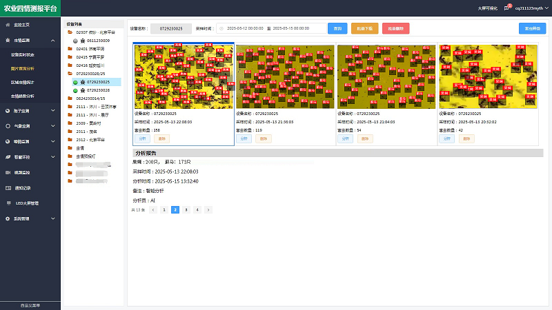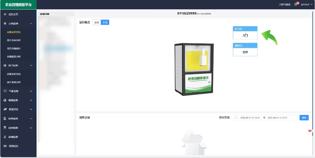 遠程控制(zhi):用戶(hu)無需親臨現場,通過農業四(si)情測(ce)報(bao)平臺即(ji)可對色誘蟲情測(ce)報(bao)儀的(de)(de)攝像頭(tou)和補光燈進行控制(zhi)。這種遠程控制(zhi)方(fang)式有(you)效提升(sheng)了設(she)備管(guan)理的(de)(de)靈(ling)活性,方(fang)便用戶(hu)及(ji)時(shi)調節害(hai)蟲收集的(de)(de)節奏和方(fang)式,以確(que)保在不同環(huan)境(jing)條(tiao)件下都能及(ji)時(shi)拍攝到清晰(xi)、準確(que)的(de)(de)蟲情圖(tu)像。