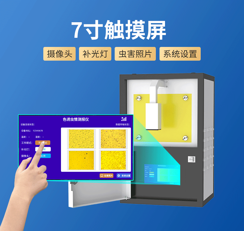 現(xian)場(chang)控制:色誘蟲情(qing)測(ce)報(bao)儀配備(bei)7寸觸摸屏,觸摸屏可實時顯示關(guan)鍵信(xin)息,如工作模式(shi)、通訊狀態、蟲害(hai)照片等,極大簡化了設(she)備(bei)的(de)監控流程,用戶還可直接通過觸摸屏開(kai)關(guan)設(she)備(bei)及設(she)置相關(guan)參數等。