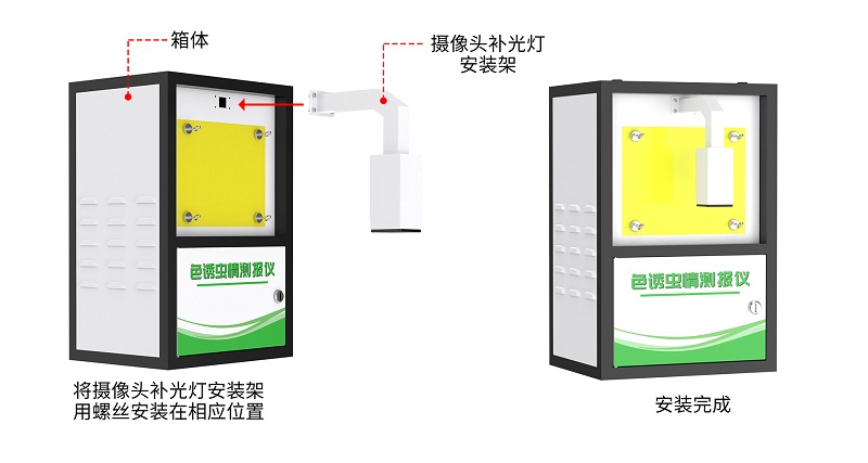 用戶(hu)只需將色(se)誘蟲情測(ce)報儀箱(xiang)體從包裝(zhuang)(zhuang)箱(xiang)內取出,對照使(shi)用說明(ming)書的裝(zhuang)(zhuang)箱(xiang)單(dan)仔(zi)細清點,檢查設備附件是否(fou)齊全后,將攝像頭補光燈(deng)安裝(zhuang)(zhuang)架用螺絲(si)安裝(zhuang)(zhuang)在(zai)相應位置即可。