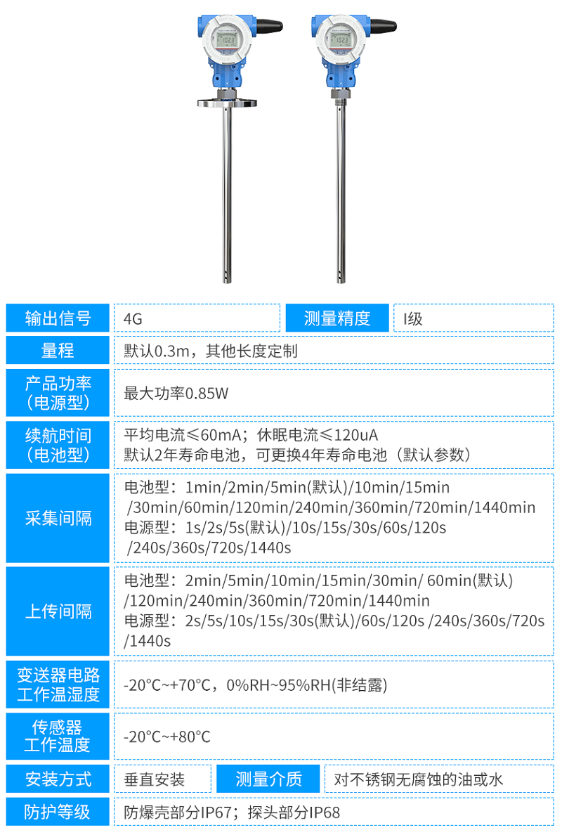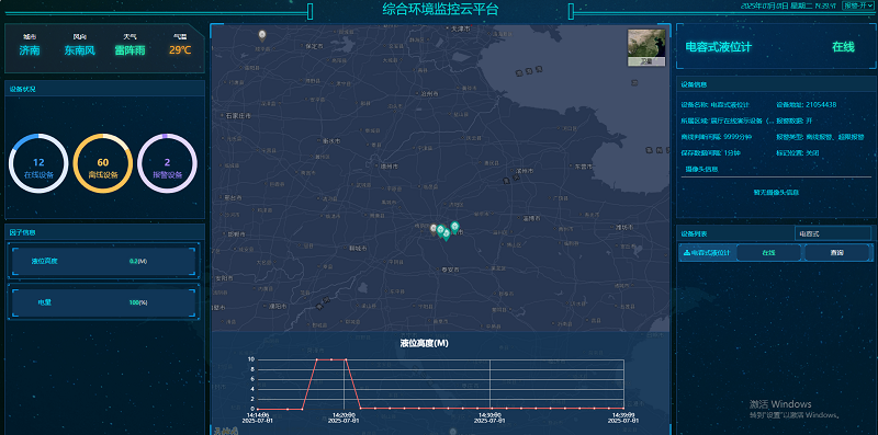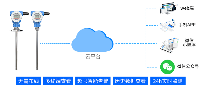 面對野外油罐、分散的(de)供(gong)水(shui)點(dian)、山(shan)區環(huan)保監測站、老舊廠區智(zhi)能(neng)化(hua)改(gai)造等場景的(de)布(bu)線困難,距離遙遠(yuan)(yuan)等監控難題,用戶可以選擇無線型電(dian)容式液位計,該設備可利用4G無線傳輸的(de)方式將監測數(shu)據上傳至環(huan)境監控云平臺,實現數(shu)據的(de)遠(yuan)(yuan)程查看(kan)和管理。