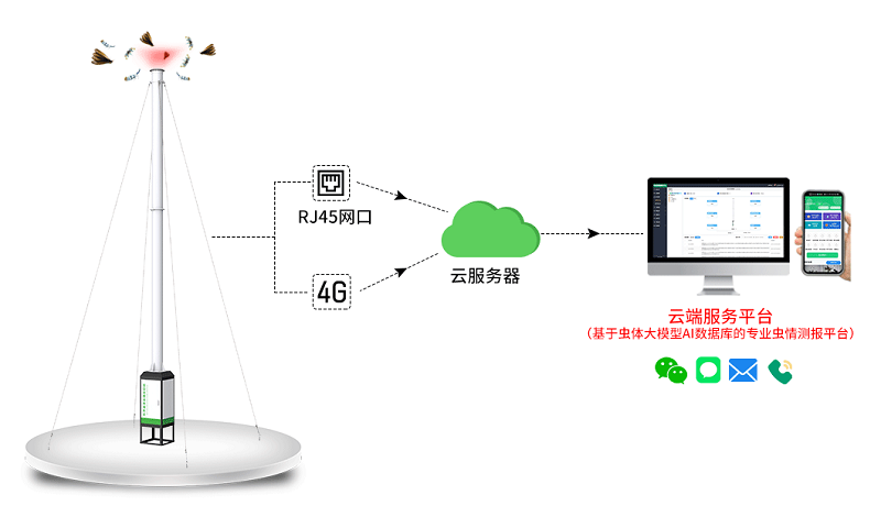 吸(xi)蟲塔智能(neng)測報系統(tong)還可(ke)以(yi)通過(guo)物(wu)聯網技(ji)術將(jiang)信息(xi)上傳至農(nong)業四(si)情測報平(ping)臺,平(ping)臺可(ke)利(li)用(yong)(yong)AI圖像識(shi)別技(ji)術對害(hai)蟲自動進行種類鑒(jian)別和數量(liang)統(tong)計,以(yi)便用(yong)(yong)戶查看(kan),提升防控效率(lv)。