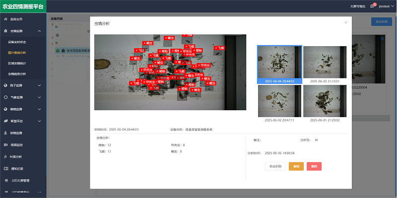 農業四情測(ce)報(bao)平臺集成了"蟲體(ti)大模型AI數(shu)(shu)據(ju)庫"系統,該數(shu)(shu)據(ju)庫基于(yu)深度學習算(suan)法構建,收錄了上千種(zhong)農作物害(hai)蟲數(shu)(shu)據(ju)。用戶可隨時調取(qu)歷史監測(ce)圖像,平臺能自動識別害(hai)蟲種(zhong)類并(bing)生成詳細分析報(bao)告,有(you)效提升病蟲害(hai)監測(ce)預警效率。