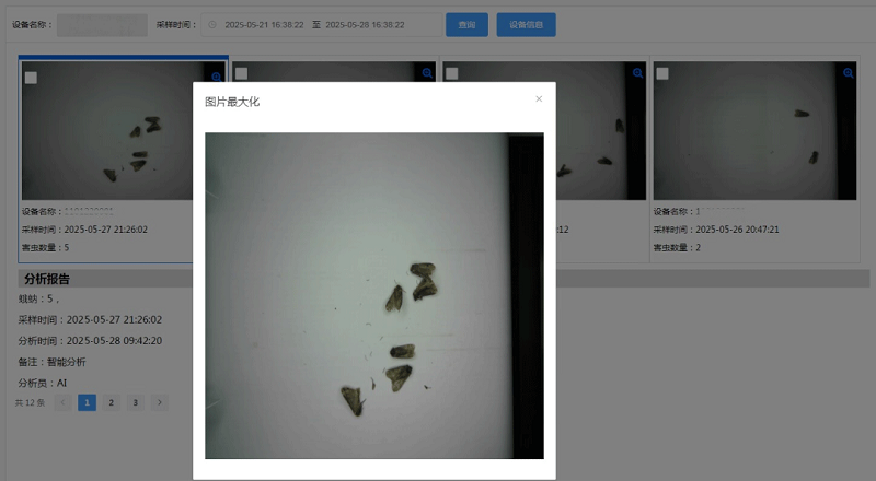 吸(xi)蟲塔智能測報系統(tong)可(ke)自(zi)動(dong)采集(ji)圖像將數(shu)據(ju)上傳(chuan)至農業四情測報平(ping)臺,平(ping)臺內(nei)置“蟲體大模型AI數(shu)據(ju)庫”,可(ke)完成蟲體圖像的自(zi)動(dong)識別分(fen)析(xi),并輸出蟲害數(shu)量(liang)統(tong)計及(ji)種類分(fen)類結果,不僅(jin)提高了數(shu)據(ju)處理(li)的效率(lv)和準確性(xing)(xing),還為構建(jian)區域性(xing)(xing)害蟲發生預測模型提供了重要數(shu)據(ju)支持。