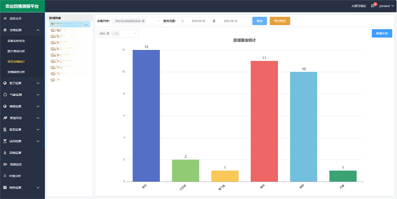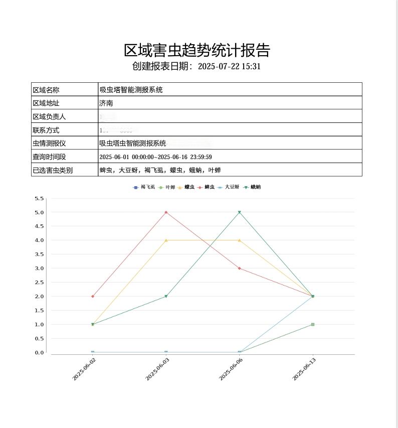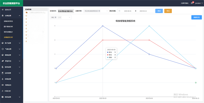 農業四情測報平臺具(ju)備(bei)強大的數據存儲(chu)和分析能力,用戶可自定義時間范(fan)圍(如近7天、1個月或(huo)整個生長季),并以(yi)條形圖(tu)的方(fang)式查看(kan)害蟲(chong)數量統(tong)計(ji)數據,或(huo)以(yi)折(zhe)線圖(tu)的方(fang)式查看(kan)不同蟲(chong)種的消長規律。