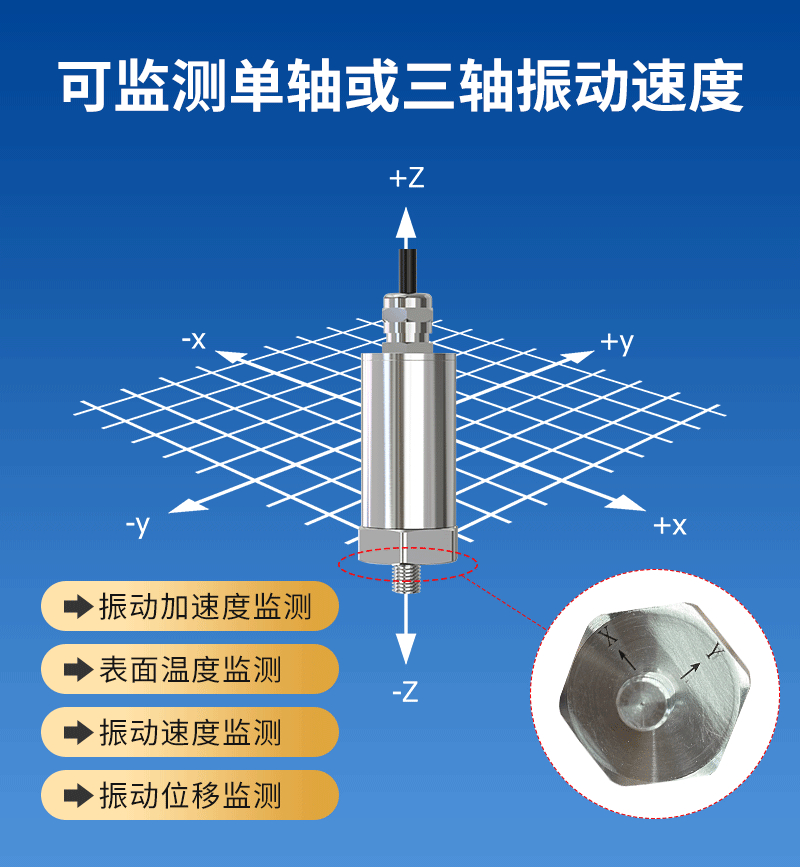 機(ji)械設備(bei)的(de)(de)振(zhen)動是一(yi)種多維度的(de)(de)動態(tai)現象,不(bu)同(tong)方向的(de)(de)振(zhen)動特征往往對應著不(bu)同(tong)類(lei)型的(de)(de)機(ji)械故障。因此,除了溫度監(jian)(jian)測(ce)功能外,用戶還可(ke)根(gen)據(ju)實際需(xu)求,靈活選(xuan)擇單軸或(huo)三軸振(zhen)動速(su)度的(de)(de)測(ce)量,從而能更(geng)精(jing)準地判(pan)斷設備(bei)運(yun)行狀態(tai),全面提升監(jian)(jian)測(ce)數據(ju)的(de)(de)可(ke)靠性。