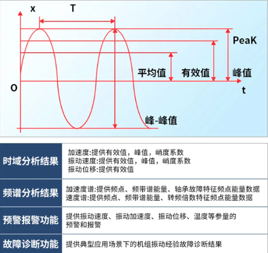 若用戶選擇(ze)頻(pin)譜(pu)型溫振變送器,除(chu)上述監測要(yao)素外,還可以為用戶同時(shi)(shi)提供(gong)速度(du)和(he)加速度(du)的時(shi)(shi)域(yu)特征值(zhi)(有效值(zhi)、峰(feng)值(zhi)、峭度(du)系(xi)數)、位移的時(shi)(shi)域(yu)特征值(zhi)(峰(feng)峰(feng)值(zhi))、頻(pin)譜(pu)分析(xi)數據和(he)故(gu)障診斷結果。