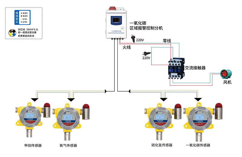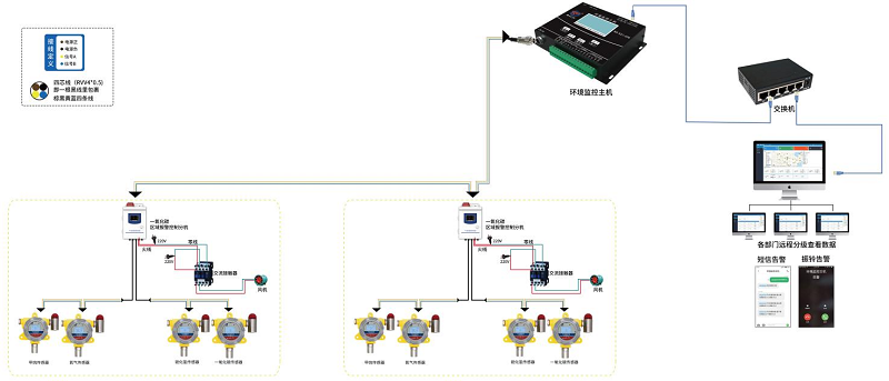 工(gong)作效果:防爆(bao)(bao)型硫化氫傳(chuan)(chuan)感器(qi)、防爆(bao)(bao)型一氧化碳傳(chuan)(chuan)感器(qi)、防爆(bao)(bao)型甲(jia)烷傳(chuan)(chuan)感器(qi)、防爆(bao)(bao)型氧氣(qi)(qi)傳(chuan)(chuan)感器(qi)通過RS485接口連接氣(qi)(qi)體(ti)區(qu)域報(bao)警控制主機,實時(shi)(shi)監測各(ge)氣(qi)(qi)體(ti)濃(nong)度(du),當其中任一氣(qi)(qi)體(ti)濃(nong)度(du)高于設定值或氧氣(qi)(qi)濃(nong)度(du)低于設定值時(shi)(shi)報(bao)警主機觸發(fa)報(bao)警,啟動(dong)聲(sheng)光報(bao)警,并聯動(dong)風機等排風系統。
