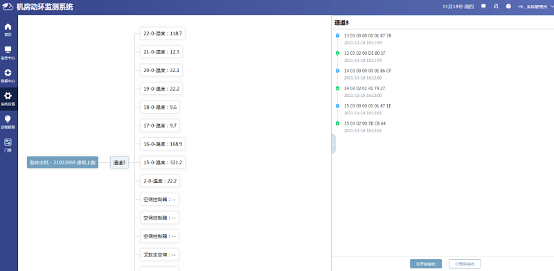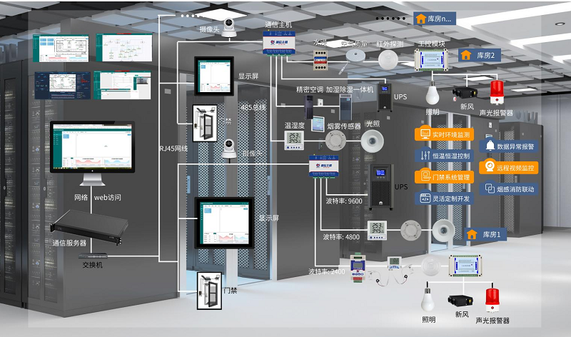 檔案(an)庫(ku)房(fang)動(dong)力(li)環(huan)境(jing)監(jian)控(kong)(kong)系(xi)統作為測(ce)控(kong)(kong)核心,具有(you)監(jian)測(ce)精確,性能穩定,界(jie)面(mian)精美等突出優點。設備(bei)通過各(ge)自(zi)的RS485總線或(huo)RJ45接(jie)口接(jie)入傳輸轉(zhuan)換模(mo)塊之(zhi)后上(shang)傳到本地(di)服務器端,即可對(dui)整個庫(ku)房(fang)的各(ge)種環(huan)境(jing)參數進行實(shi)時而精確的監(jian)測(ce)。同時動(dong)力(li)環(huan)境(jing)監(jian)控(kong)(kong)系(xi)統通過不同自(zi)定義方法對(dui)倉庫(ku)內的燈光(guang)、窗簾、空(kong)調、門(men)禁進行自(zi)動(dong)控(kong)(kong)制,整個系(xi)統可靠,實(shi)用,精確,能更好地(di)為高品質倉儲(chu)和生產服務。