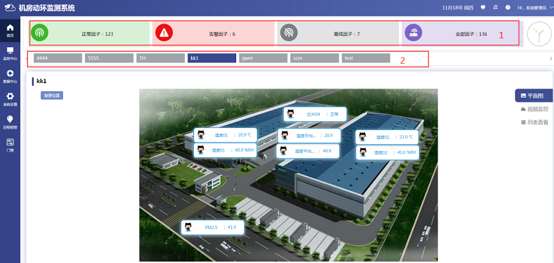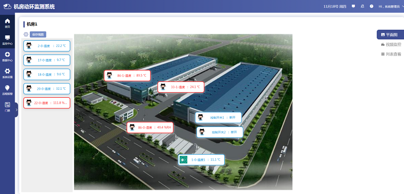 · 大屏可(ke)視化(hua)頁(ye)面輪播每個機房(fang)平面圖,同時兩側的信息也會隨機房(fang)變化(hua)而變化(hua)。