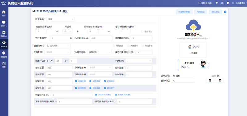· 添加(jia)因子時可根據不(bu)同(tong)因子類型(xing)添加(jia),包括溫濕(shi)度、平(ping)均值、紅外、煙(yan)感、水(shui)浸、控制開(kai)關、空(kong)調控制器、空(kong)氣質量、其他非modbus設備等(deng)等(deng)