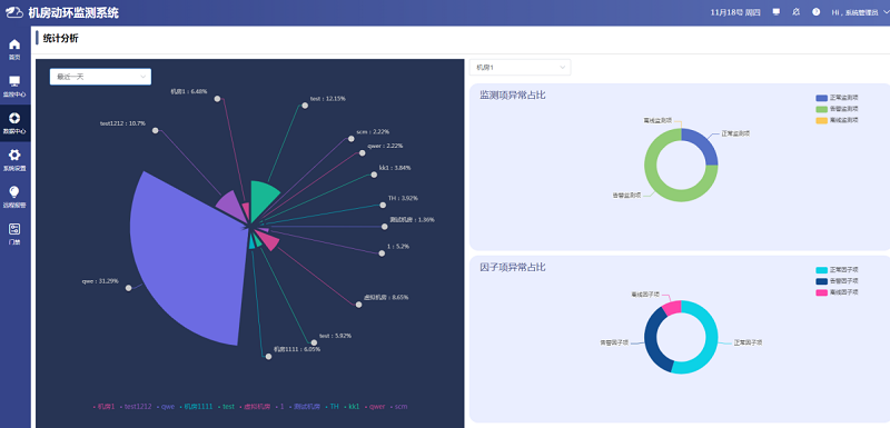 · 統計分析頁(ye)面左側(ce)顯示該賬號下所有有權限的(de)機(ji)房,某時段內報警次數占總(zong)報警次數的(de)百分比。