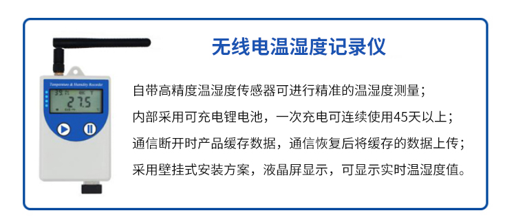 在(zai)物品(pin)運輸過程中使用的無線電溫(wen)濕(shi)(shi)(shi)度記錄儀,它是一(yi)款低功耗(hao)無線傳輸溫(wen)濕(shi)(shi)(shi)度測點 ,帶(dai)有(you)液晶(jing)屏可實時顯示(shi)溫(wen)濕(shi)(shi)(shi)度數(shu)據。產品(pin)采用公司獨有(you)的無線電技術上(shang)傳至主機(ji),信號可輕松穿透車輛冷(leng)藏箱體(ti),將數(shu)據上(shang)傳至駕駛室的主機(ji)上(shang)。