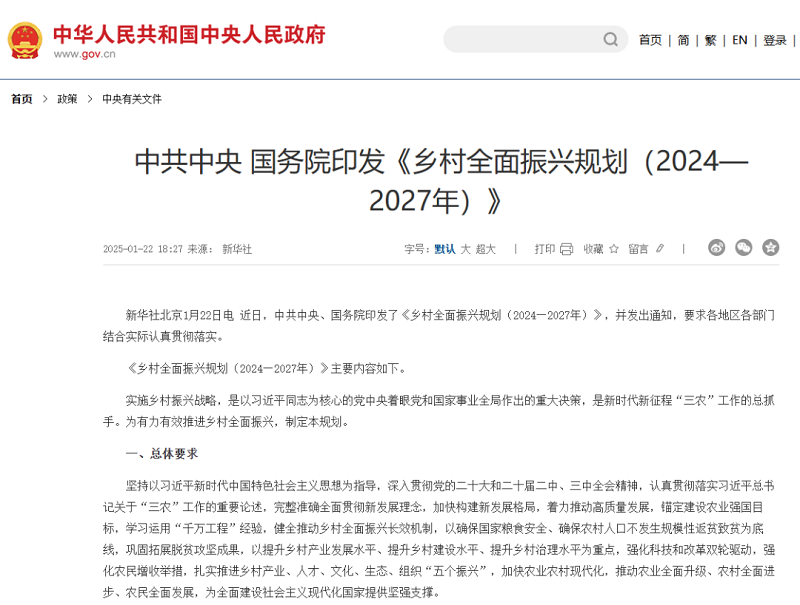 中共(gong)中央、國(guo)務院也于近日(ri)印發(fa)了《鄉村(cun)全面振興規劃(2024—2027年(nian))》,并發(fa)出(chu)通(tong)知,要求各地區各部門結合(he)實際認(ren)真(zhen)貫(guan)徹落實。