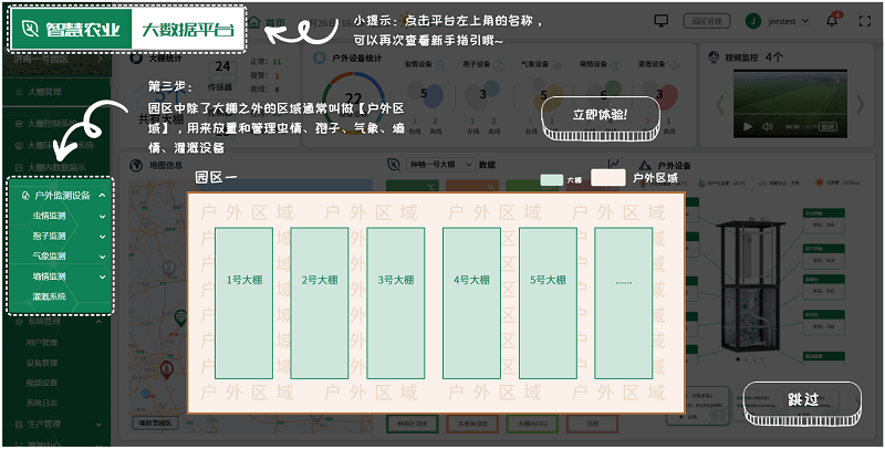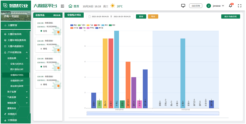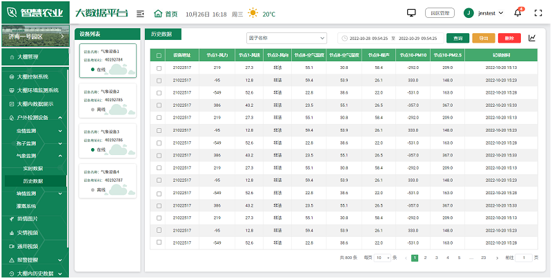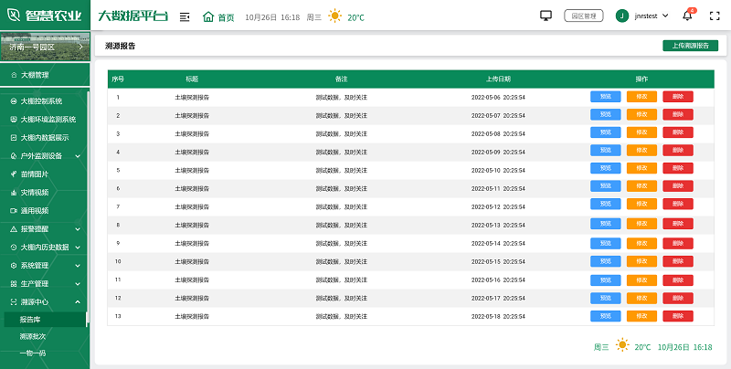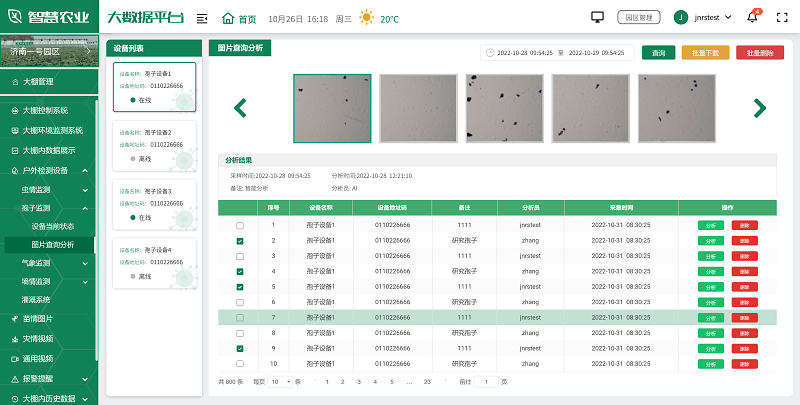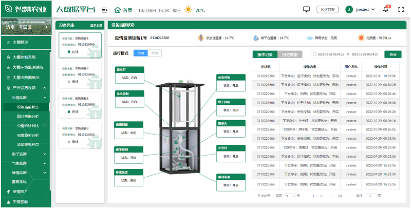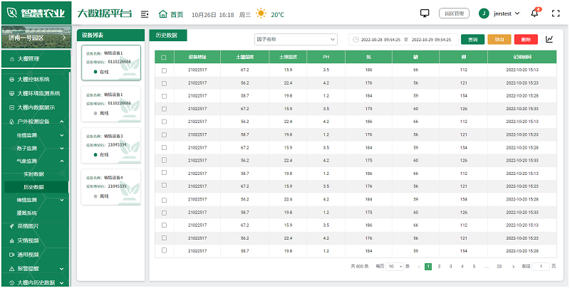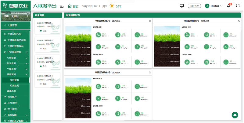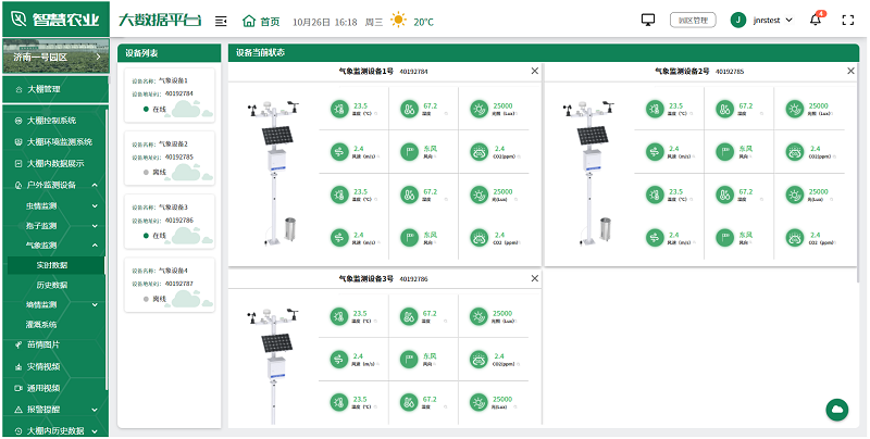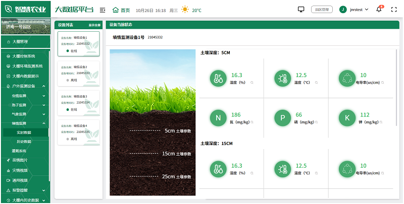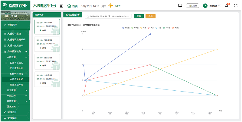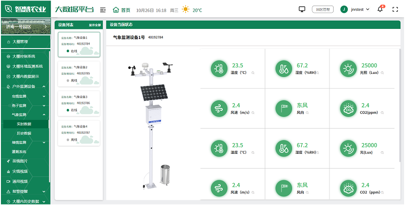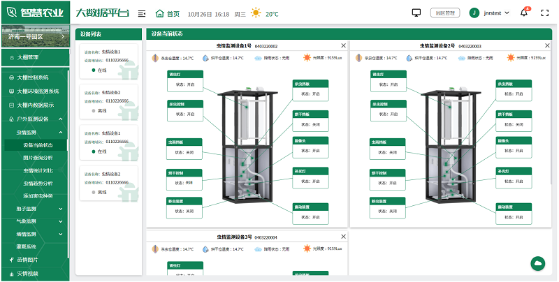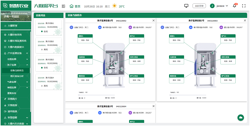 用(yong)戶可根(gen)據實際情況(kuang),選擇安裝在(zai)園(yuan)區(qu)的(de)各種監測設(she)備,如土壤濕(shi)度傳感器、氣象(xiang)站、蟲情測報(bao)儀、孢(bao)子捕捉分(fen)析儀等,全(quan)面(mian)監測園(yuan)區(qu)的(de)環境(jing)變(bian)化(hua),及(ji)時發現(xian)并(bing)解決生(sheng)產中的(de)問(wen)題,為未(wei)來的(de)農業生(sheng)產提供科學依據。