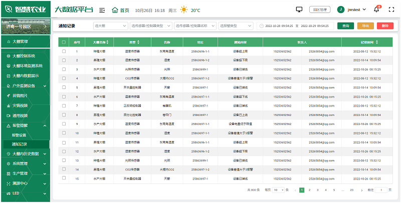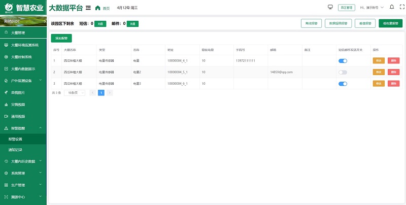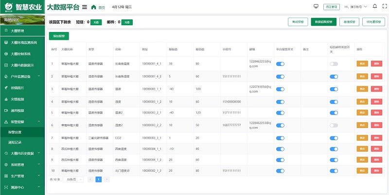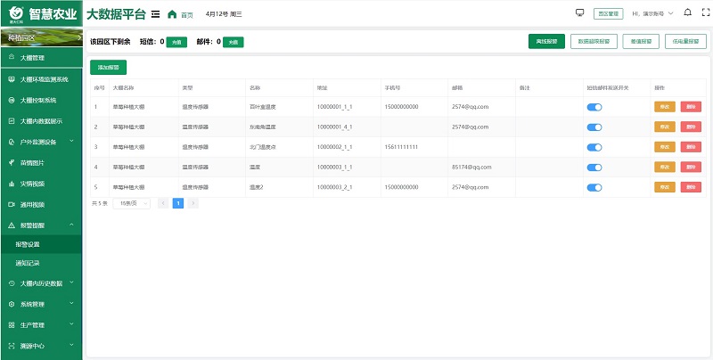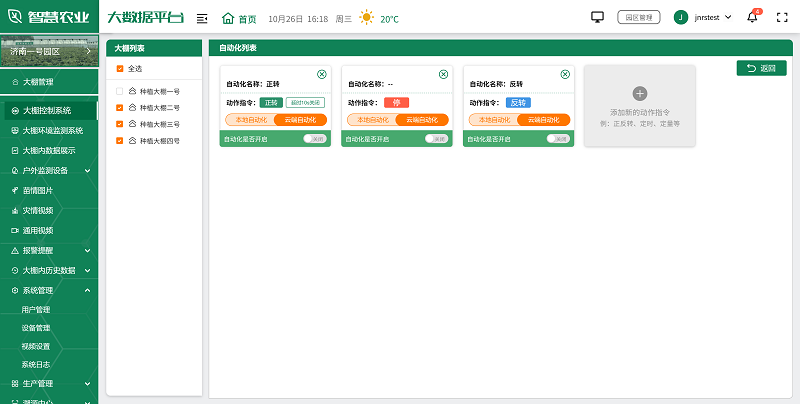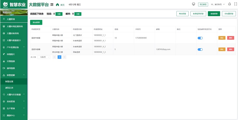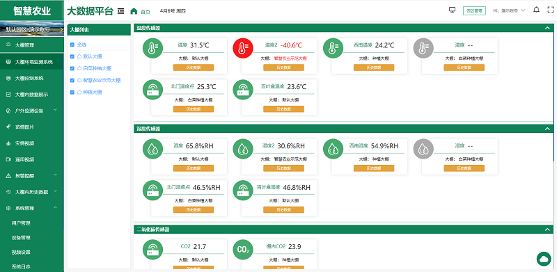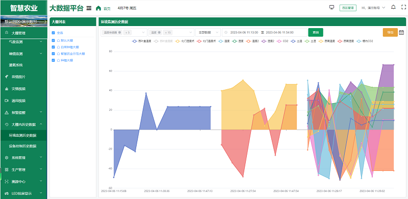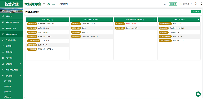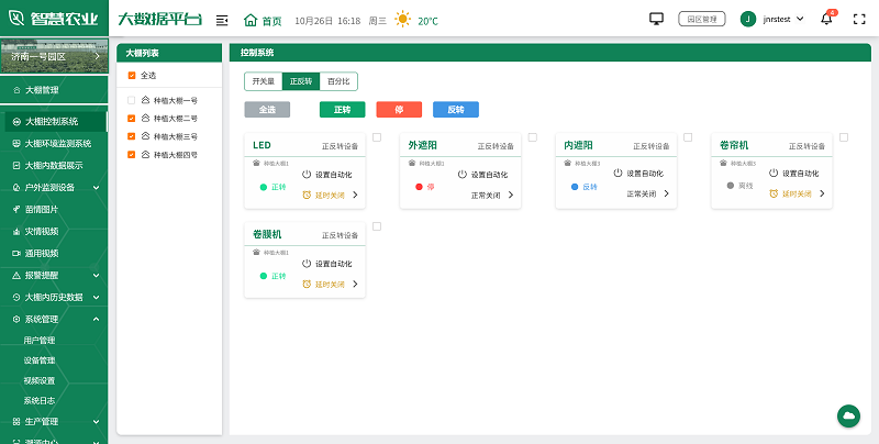 智(zhi)慧(hui)農業大數(shu)據平(ping)臺通過(guo)連(lian)接各種智(zhi)能傳感器和(he)設備,實現了對棚內(nei)/戶(hu)外環(huan)境(jing)的實時監測和(he)精準調控。平(ping)臺可以(yi)實時收集溫濕度、光照強度、二(er)氧化碳濃度等關鍵參數(shu),還擁有開關量、正反(fan)轉、百分比控制功能,能夠通過(guo)數(shu)據分析,自動調節棚內(nei)環(huan)境(jing),也能通過(guo)手機(ji)或電腦隨時進行遠(yuan)程(cheng)控制,確保作(zuo)物在最適宜的條(tiao)件下生長(chang),實現智(zhi)能管理。