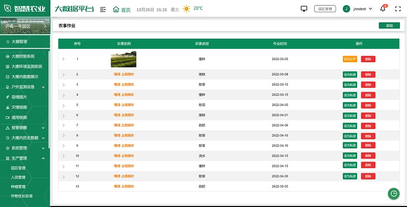 生產(chan)管(guan)(guan)理(li)是智慧農業大(da)數(shu)據平臺(tai)(tai)的(de)核心功能(neng)之(zhi)一。通過集成各種生產(chan)管(guan)(guan)理(li)系統,平臺(tai)(tai)實現了對(dui)農業生產(chan)全過程(cheng)的(de)數(shu)字化管(guan)(guan)理(li)。從種植、施肥(fei)、灌溉(gai)到收獲(huo),每(mei)個環節都可以在平臺(tai)(tai)上進行記(ji)錄和管(guan)(guan)理(li)。平臺(tai)(tai)支持農事任務(wu)分(fen)配、人員(yuan)管(guan)(guan)理(li)、農機管(guan)(guan)理(li)、物料管(guan)(guan)理(li)、為作(zuo)物設置生長標準等功能(neng),幫助管(guan)(guan)理(li)者優化生產(chan)流程(cheng),提高工作(zuo)效率。